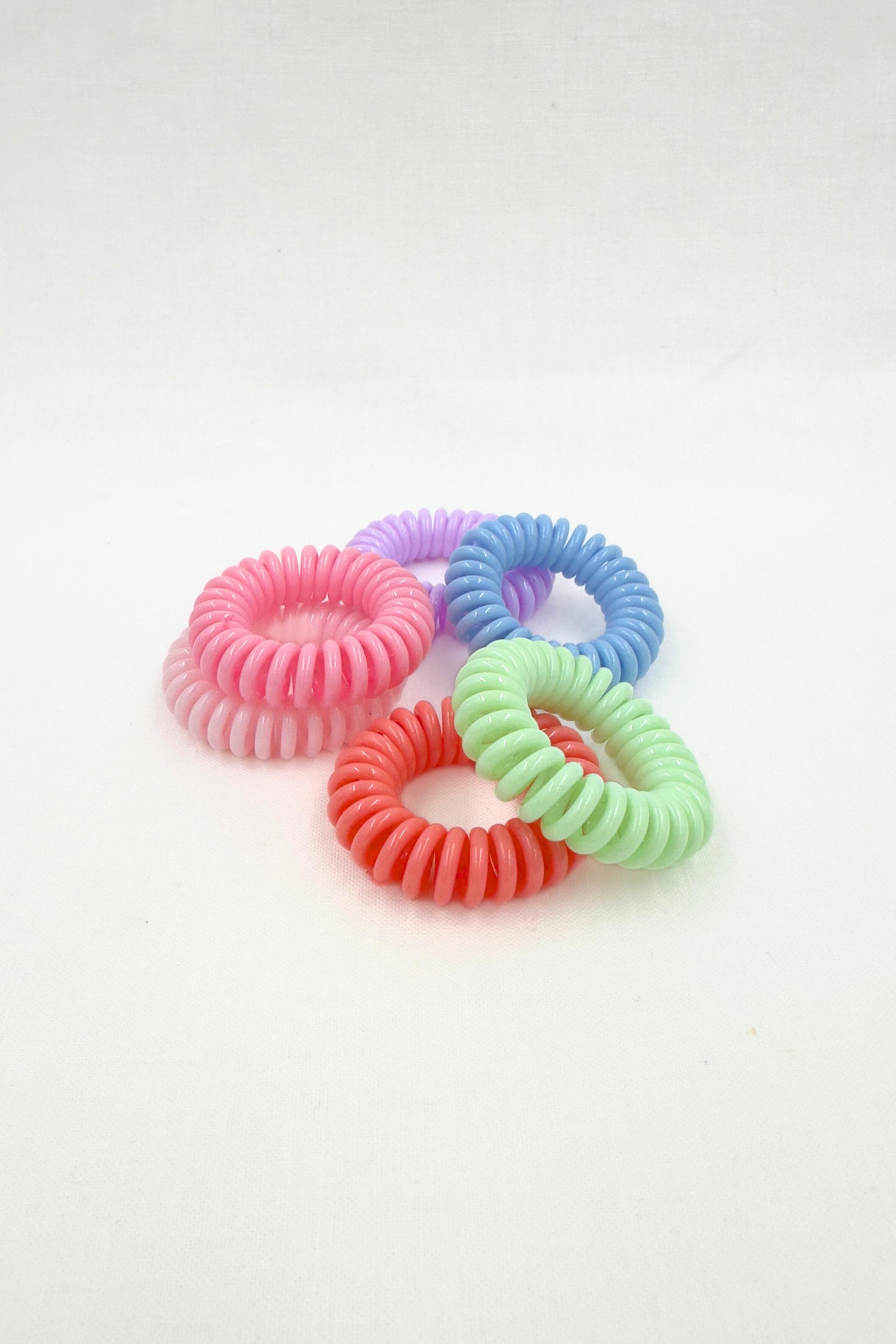 Enjoy a playful pop of color with this set of two spiral scrunchies. Each pair comes in random pastel shades from six delightful colors, adding a fun surprise to your hair accessories. Perfect for mixing and matching to brighten up any hairstyle with ease!