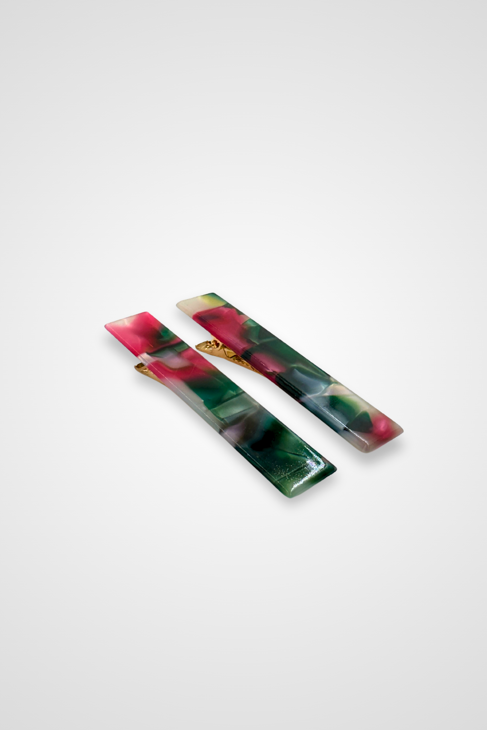 Add a touch of romance to your look with the Barrette Rose Garden. Featuring charming red and green hues, this playful accessory brings a fresh, floral vibe to any hairstyle. Perfect for brightening your day with a hint of garden-inspired elegance.