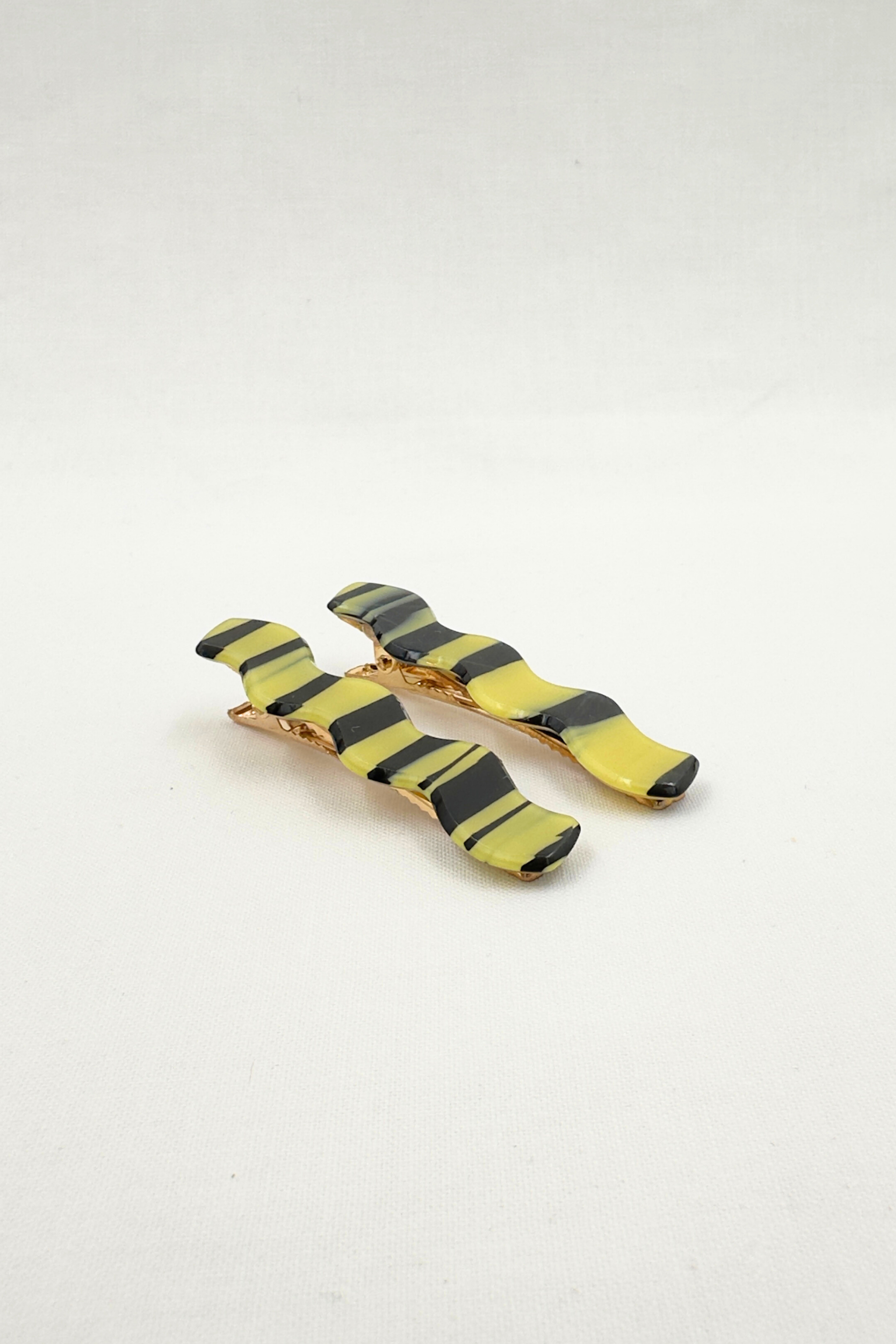 Make a bold statement with this wavy barrette in striking black and pale yellow. Its unique design adds an edgy twist to your hairstyle, perfect for those who dare to stand out. Elevate any look with this eye-catching accessory that blends modern flair with subtle contrast.
