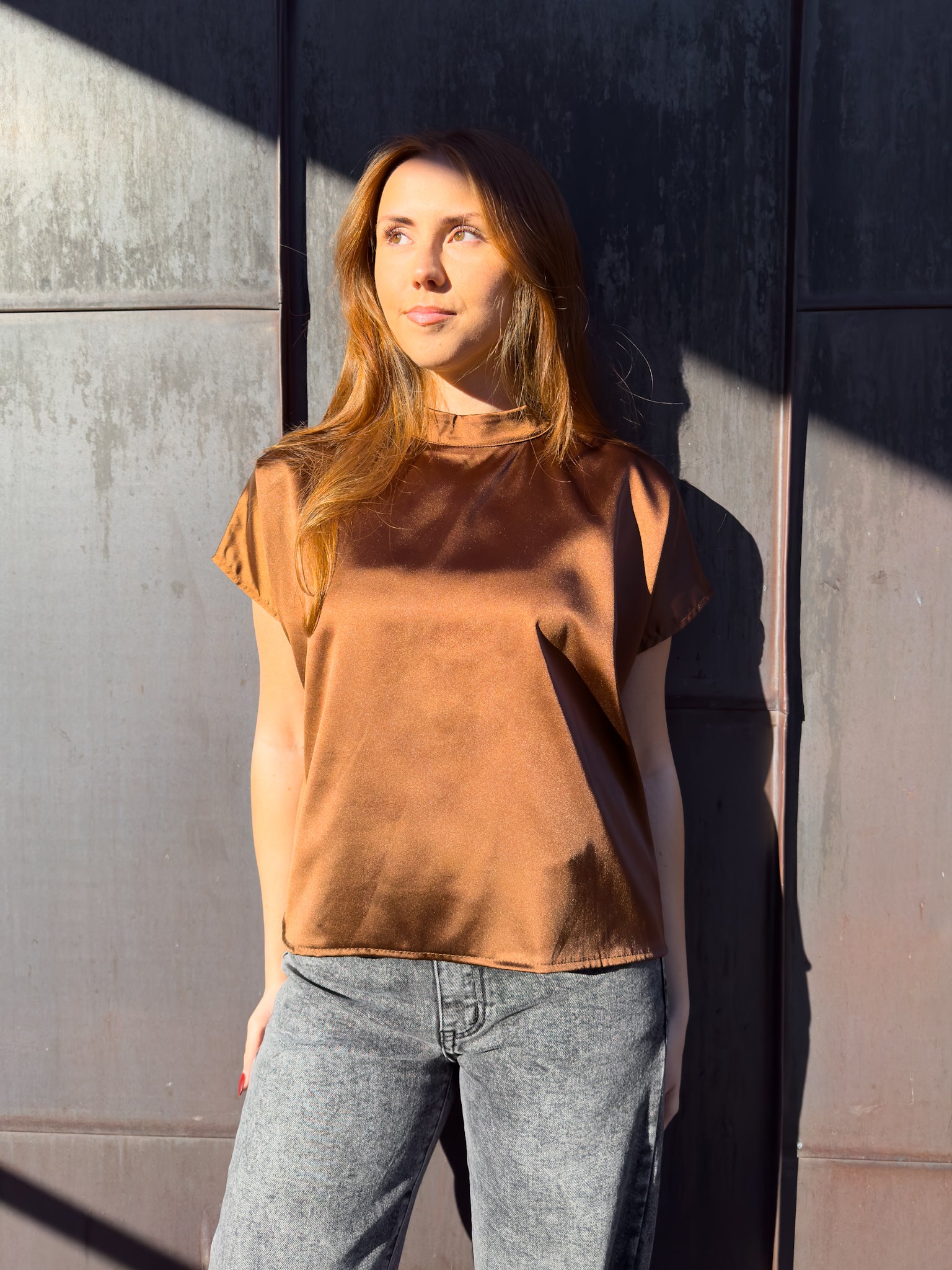 Crafted from smooth, shiny satin, this short-sleeve top features a neat round collar and a zipper closure at the neck, blending modern design with classic elegance. Its versatile silhouette works effortlessly for both polished everyday looks and elevated dress-up ensembles, providing a stylish, comfortable option for diverse occasions.