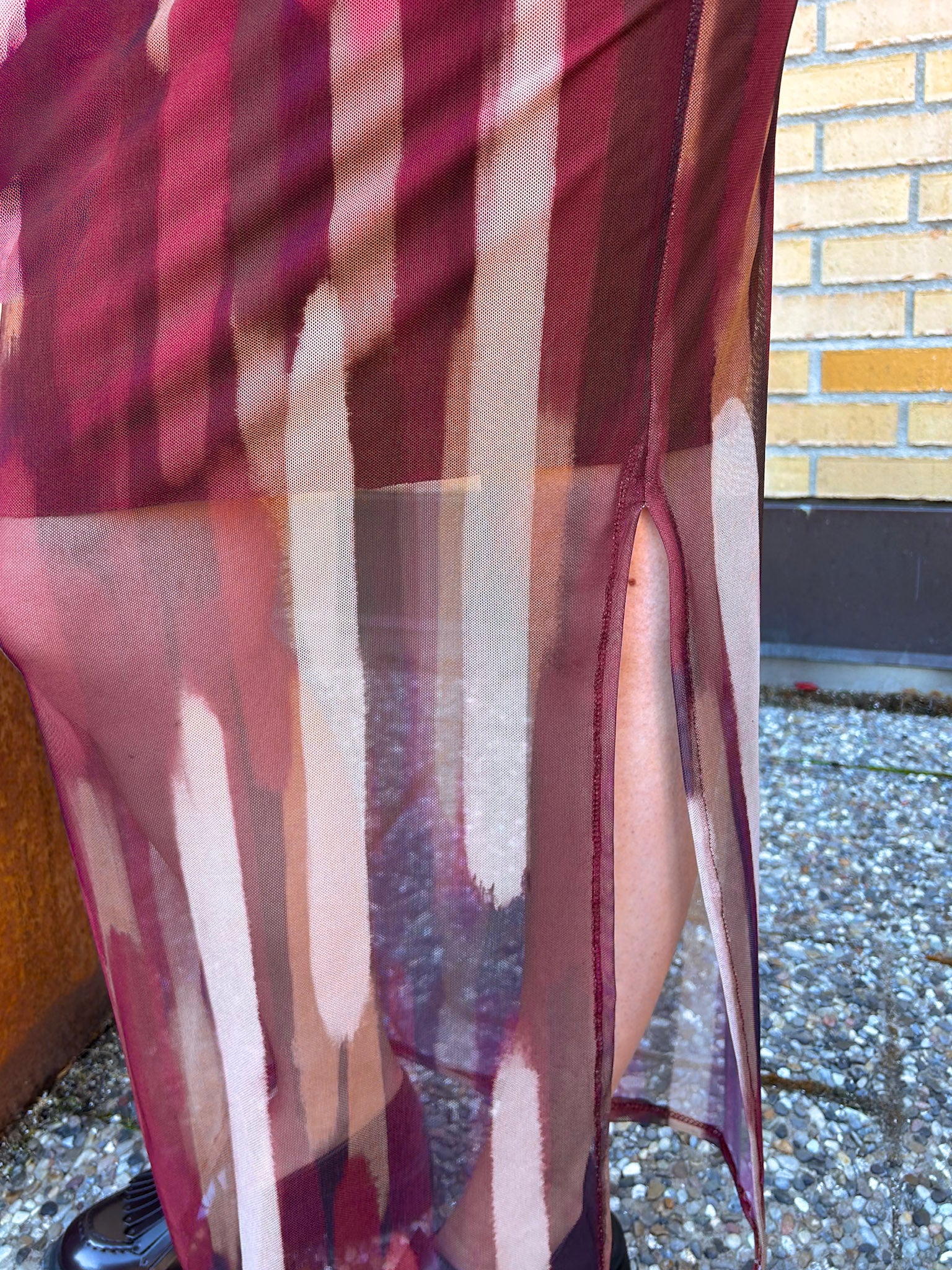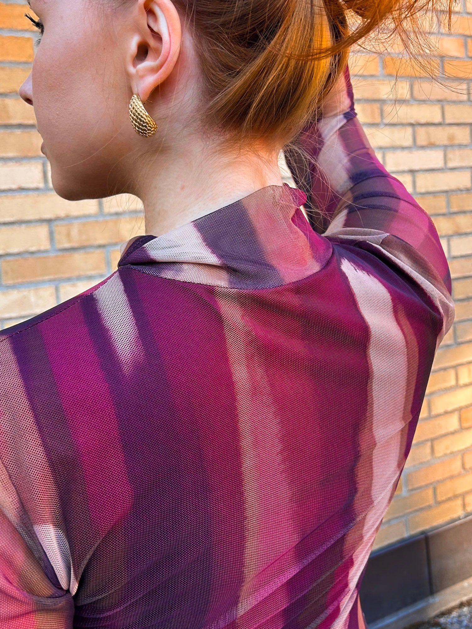 Elevate your wardrobe with our new long sleeve mesh dress, featuring a captivating painted pattern in bold bordeaux and soft beige tones. The small stand collar adds a sharp, edgy touch, making it perfect to stand out whether you're dressing up for everyday confidence or unforgettable special events. Embrace the allure of sheer mesh combined with vibrant artistry designed to turn heads wherever you go.